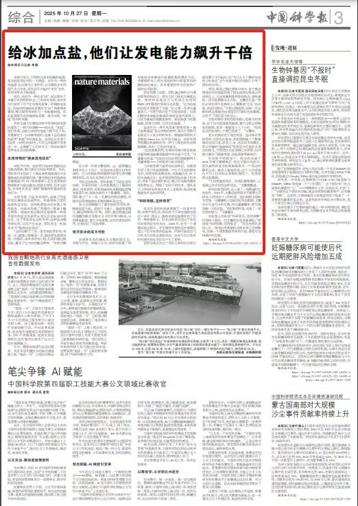 然而,水的另一种形态“冰”,却长期处于未被开发利用的状态。已有研究发现,冰在非均匀变形下可产生电极化现象,即挠曲电效应。但纯冰的挠曲电系数仅为 10-10 纳库每米量级,难以提供有效的力 - 电能量转换。因此显著提升冰的挠曲电系数,成为实现“冰能”利用的关键。西安交通大学教授申胜平带领的研究团队提供了一种巧妙策略———向冰里“加盐”。他们发现,这能让冰的发电能力提升近千倍。其奥秘在于,当冰被弯曲时,盐离子会沿着冰的晶界“奔跑”并形成电流。这项近日发表于《自然 - 材料》的研究,不仅让冰能源开发更进一步,还刷新了人们对木卫二等冰封海洋世界电学活动的理解。